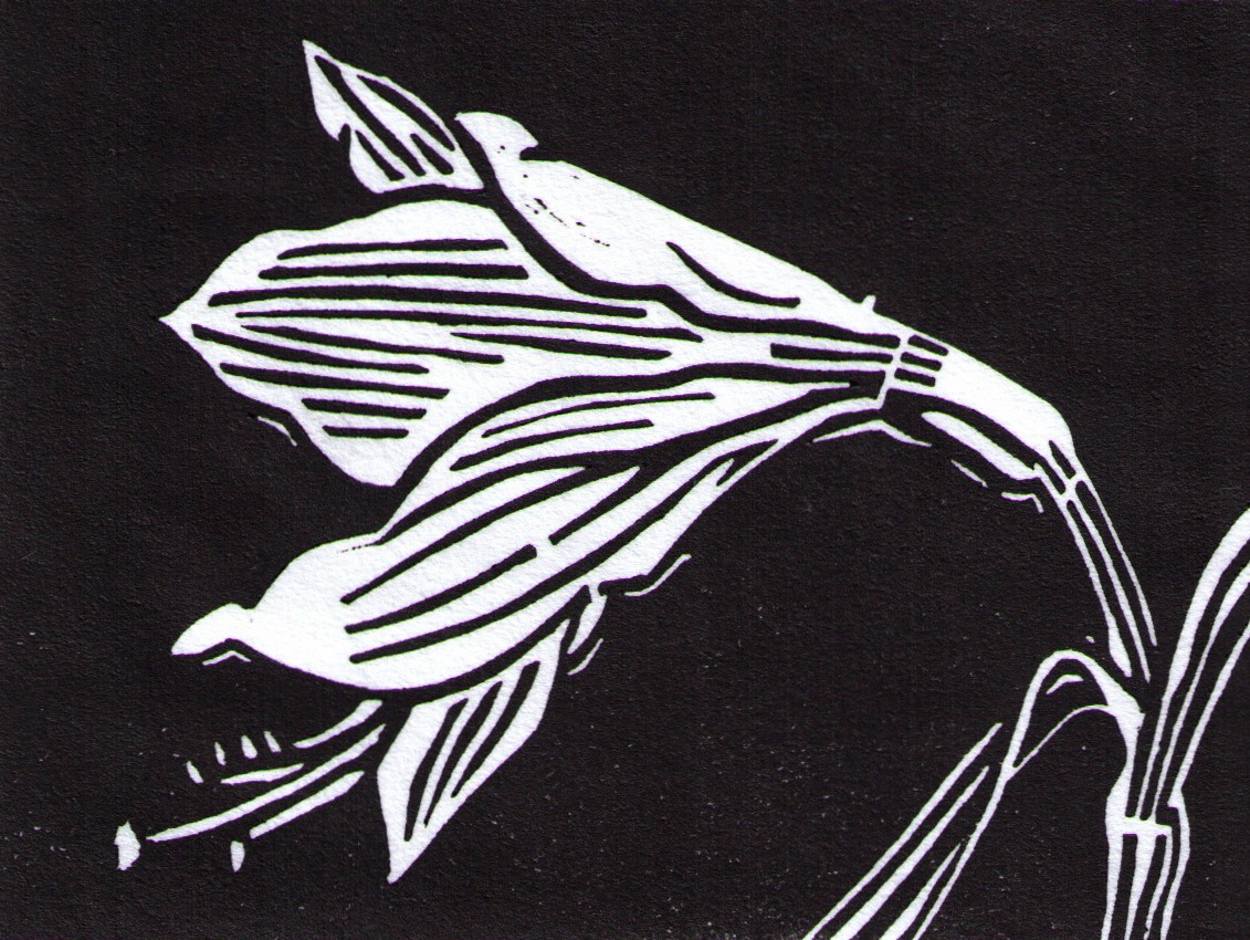 Linocut. Water-soluble ink on rice paper. 2 7/8″ x 3 7/8″