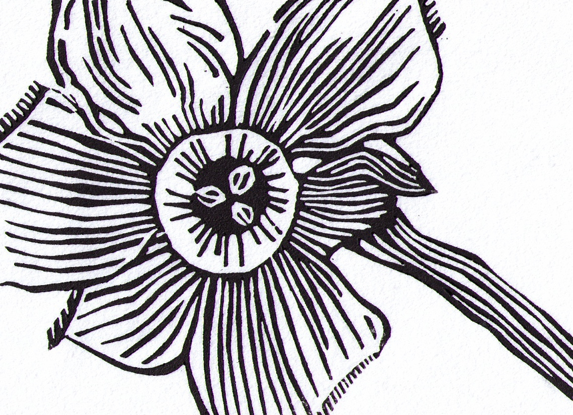 Linocut. Water-soluble ink on rice paper. 2 7/8″ x 3 7/8″