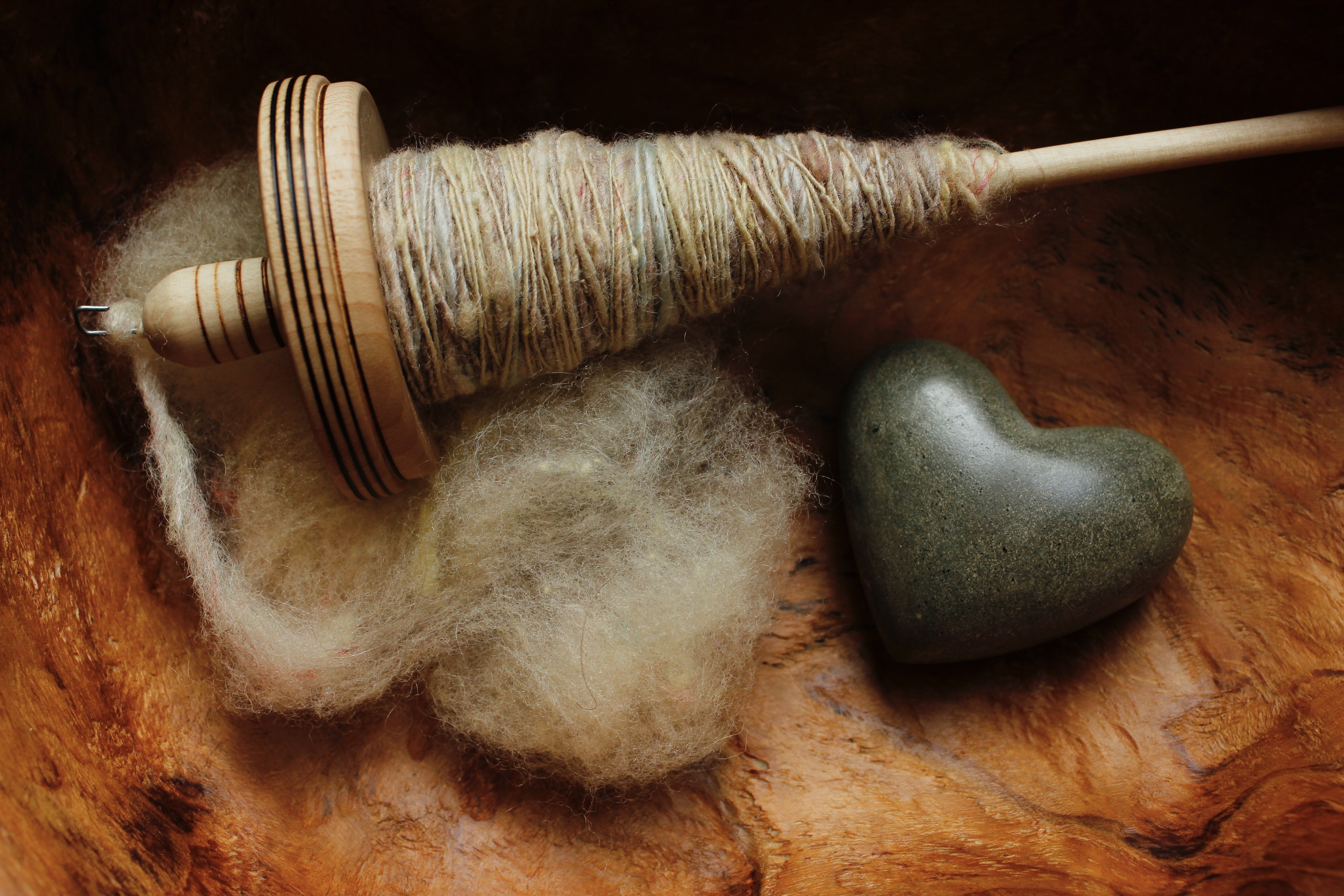 Top-whorl drop spindle from Crafty Jaks. Bowl carved by my dad. Stone heart: gift from my mom. B. Wanhill, Canon T3i. July 2023.