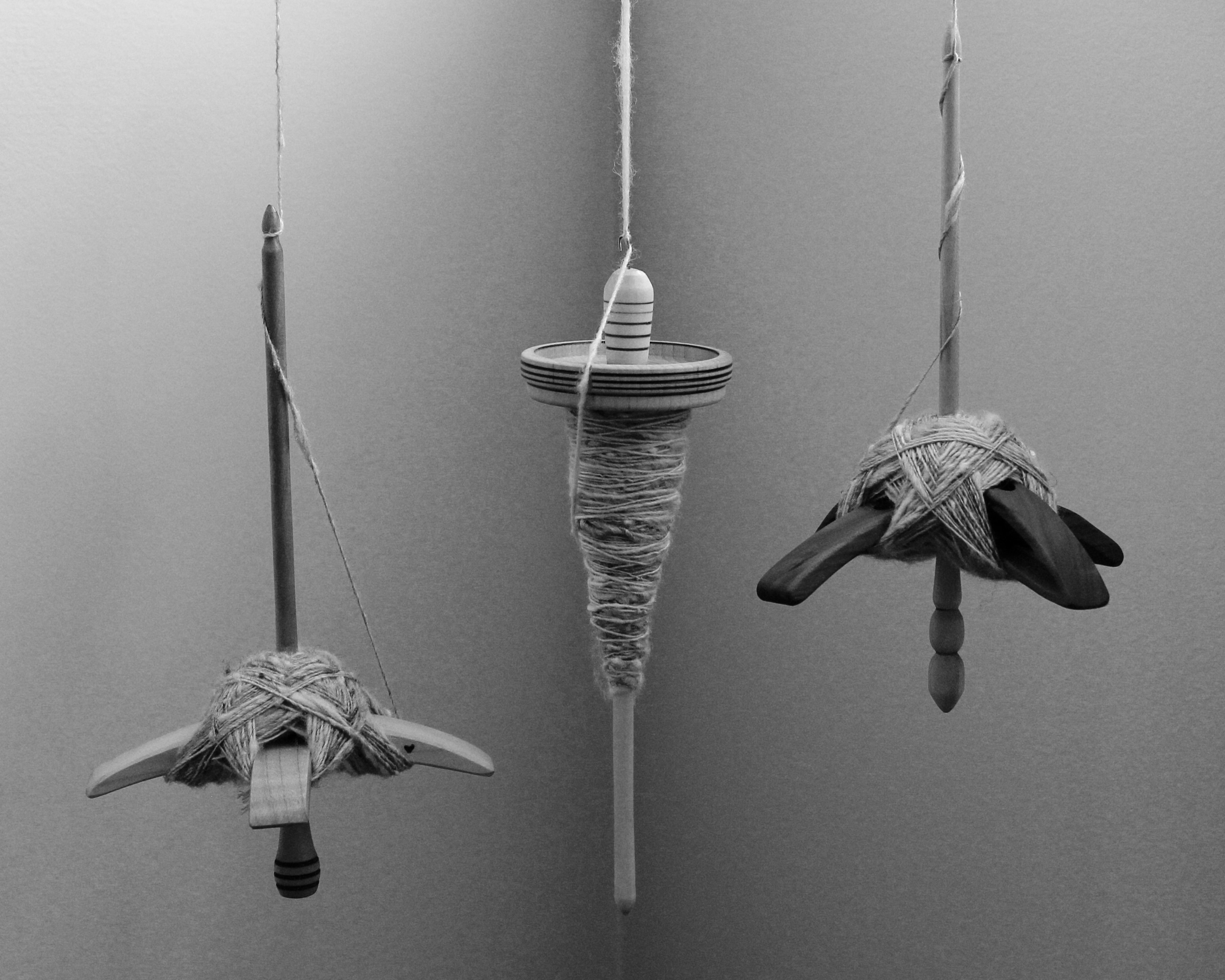 Three drop spindles. The two on the left from Crafty Jaks, The one on the right from Snyder Spindles. B. Wanhill, Canon T3i. July 2023