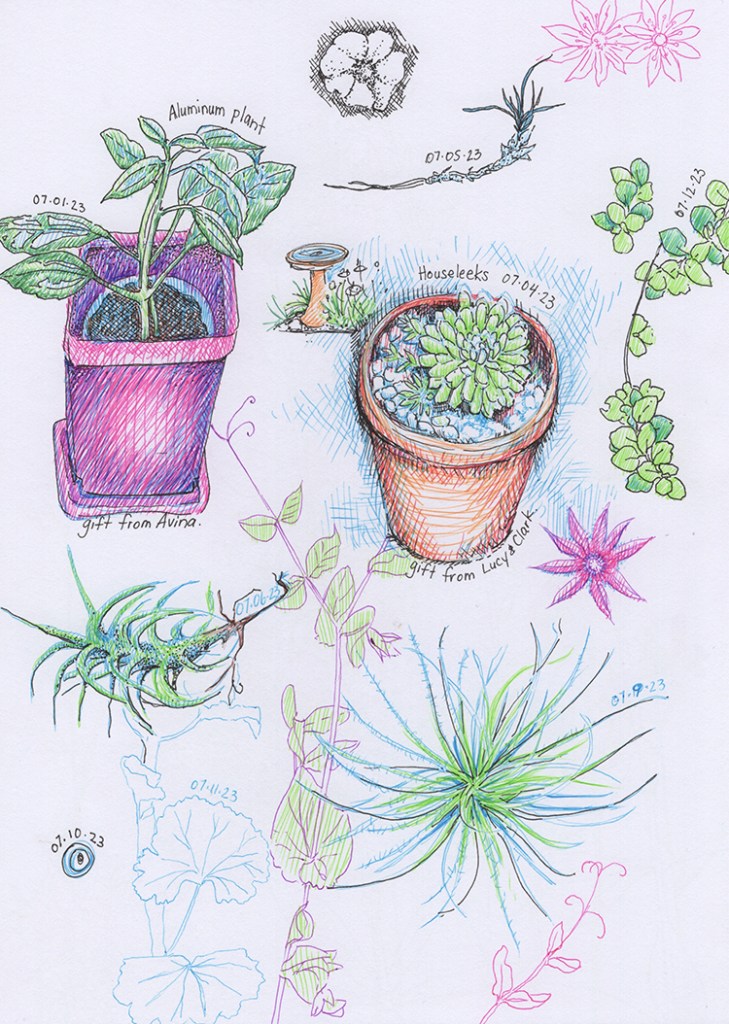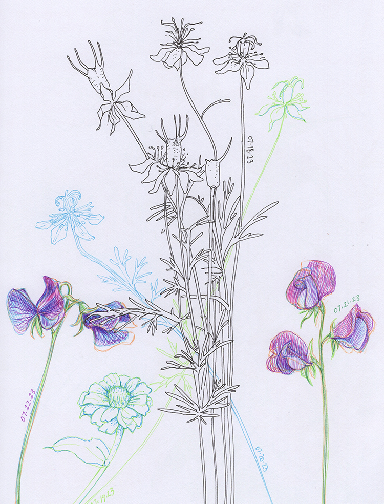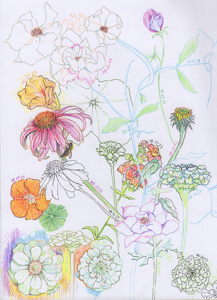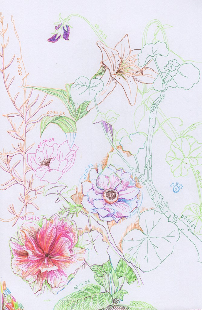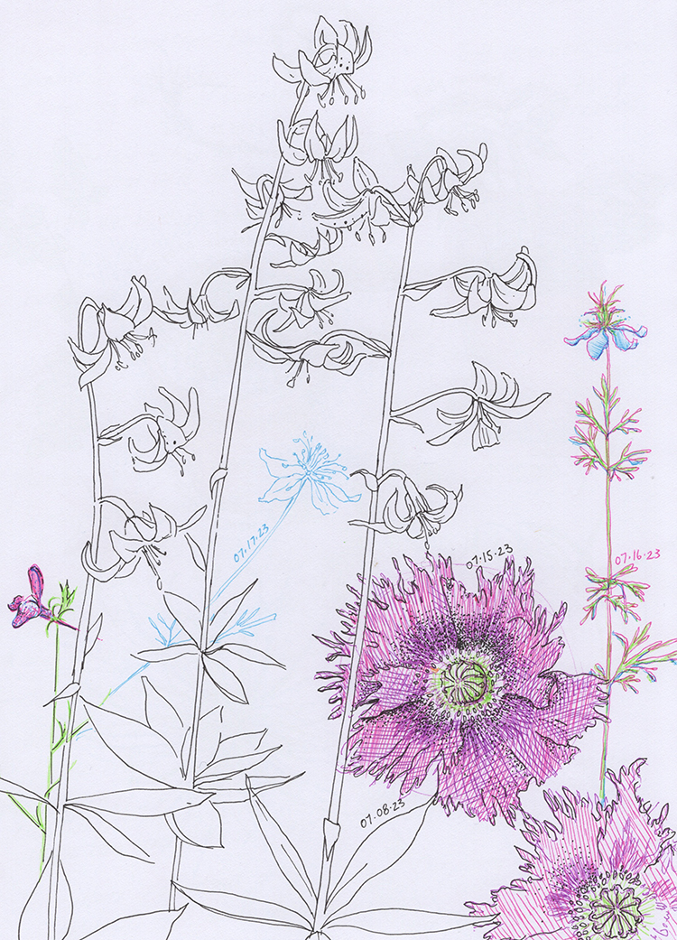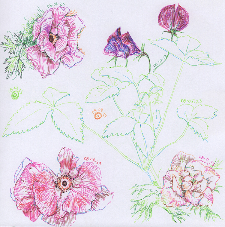 The parameters for summer drawing were: pen, no pencil pre-plannning, botanical and from life, not photos. I began with a Faber-Castell Pitt Artist Fineliner 0.1 at the beginning of July, but then soon gravitated towards a package of Staedtler Ball 432s from Staples (since redesigned and manufactured in a different country – yet to be determined whether the new ones will hold up). Any day I did not draw, I drew a small circle. Some days: a mix of the two types of pens. One day, a plastic lily stood in for something live. Lots of mistakes. I dated each set of marks. Keeping things simple and being flexible to new ways of working has continued to build my confidence as a person who draws daily.