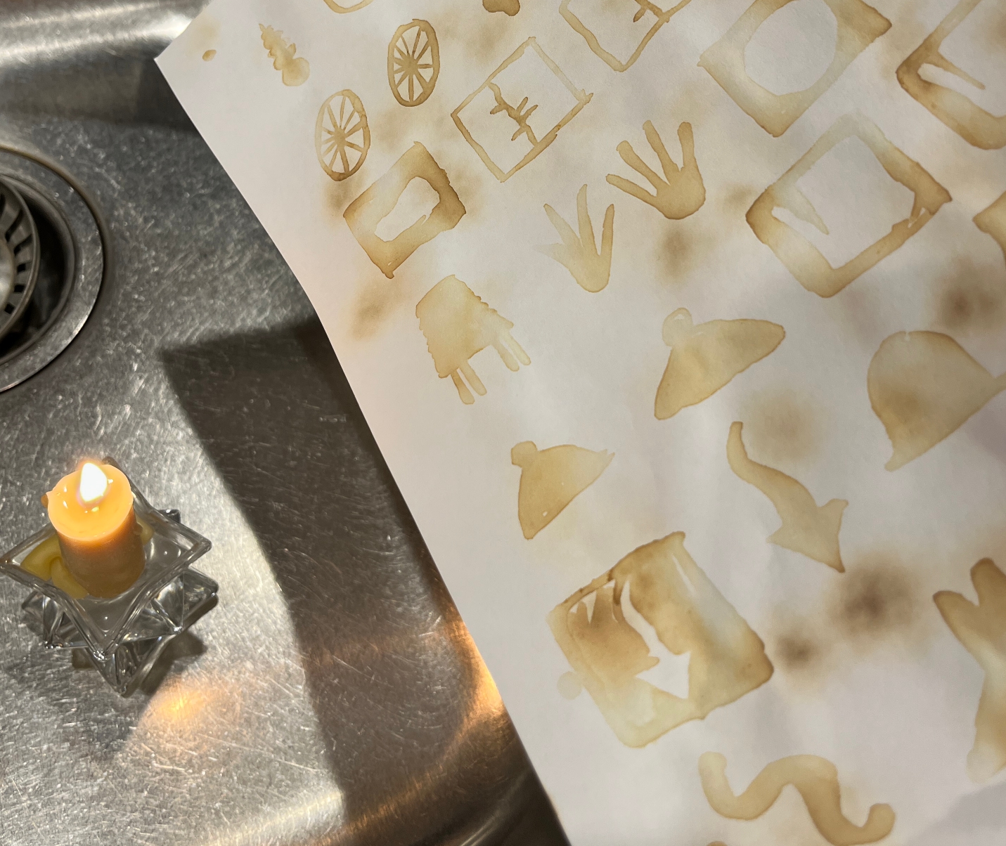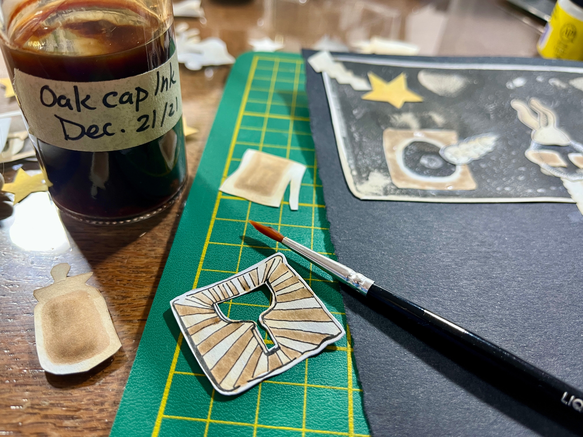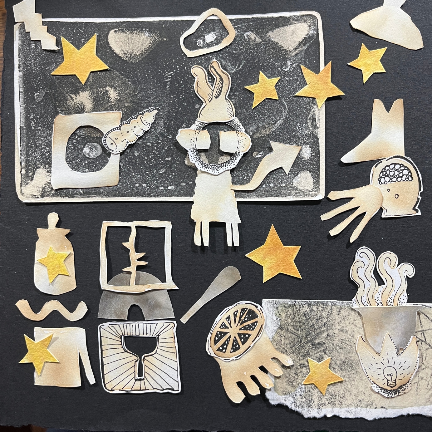 The collage was created with leftover bits of plain and gelli printed paper, onion skin dyed paper stars, lemon juice burned shapes and details added with some homemade acorn cap ink, coloured pencils and ink pen. I am happy the imagery came together like this: leftovers orchestrated to create a non-sensical paper space-time dream.