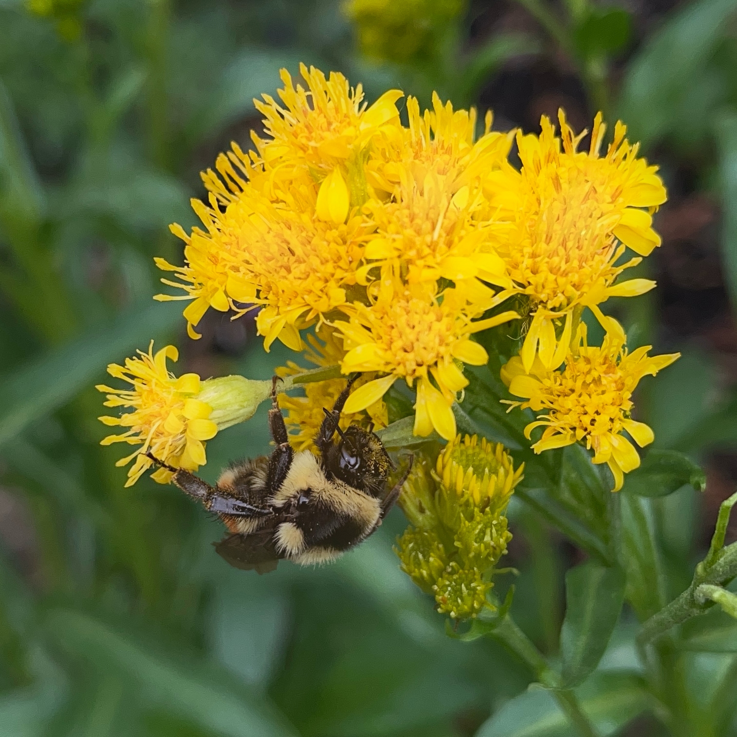 Impatience followed me into my solar dying with solidago experiment. On June 15 (before summer!) I carefully hand selected goldenrod blossoms from the small stand being attentively attended by bees. I grabbed a small hank of what I thought was vintage silk – a gift from my mom’s stash – and dutifully mordanted it with kitchen alum. Solar dyeing enthusiasts suggest placing dye material in a bag for convenience and it all went tidily into a small jar which enjoyed sunshine and heat on our window sill for 13 days (until the impatience kicked in). The result was a pale butter yellow colour which turned into a sturdy yarn for spinning (and which I quickly found out from the texture, was mohair!).
