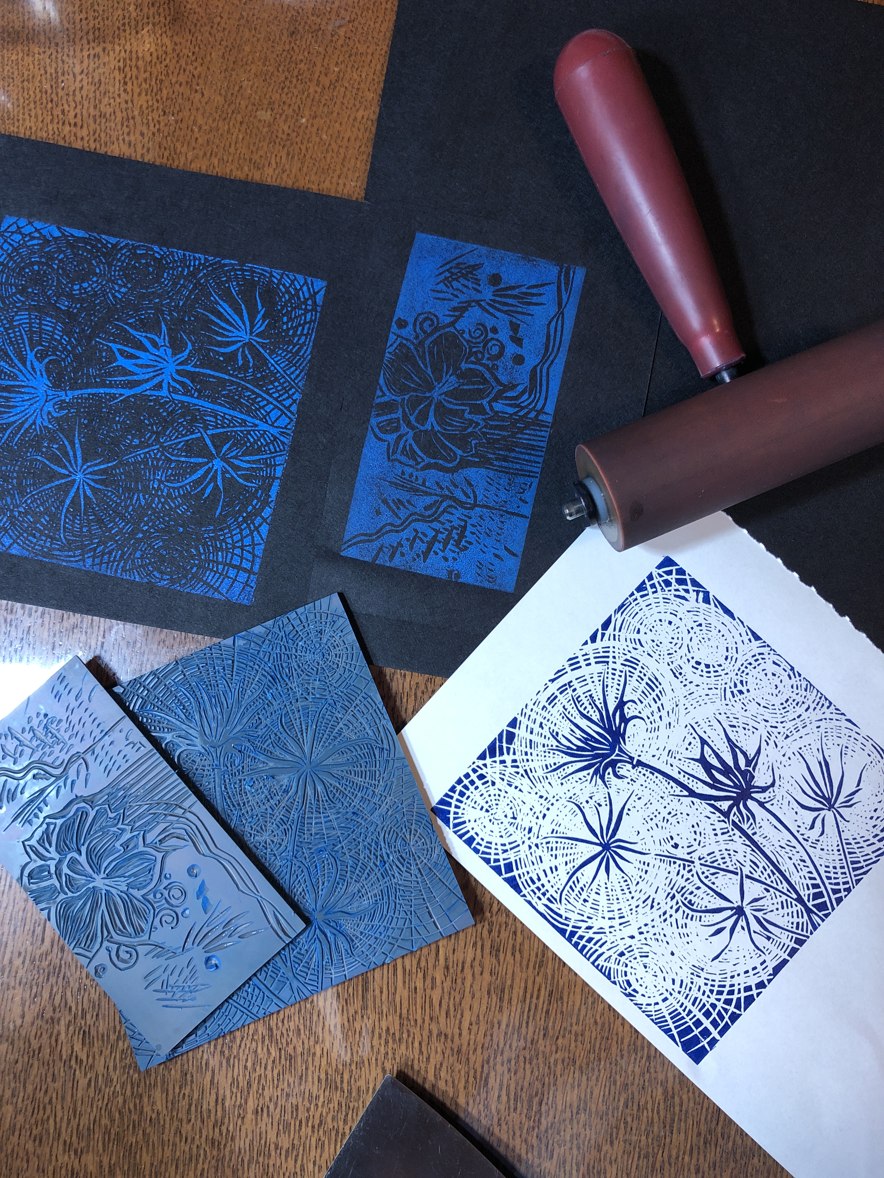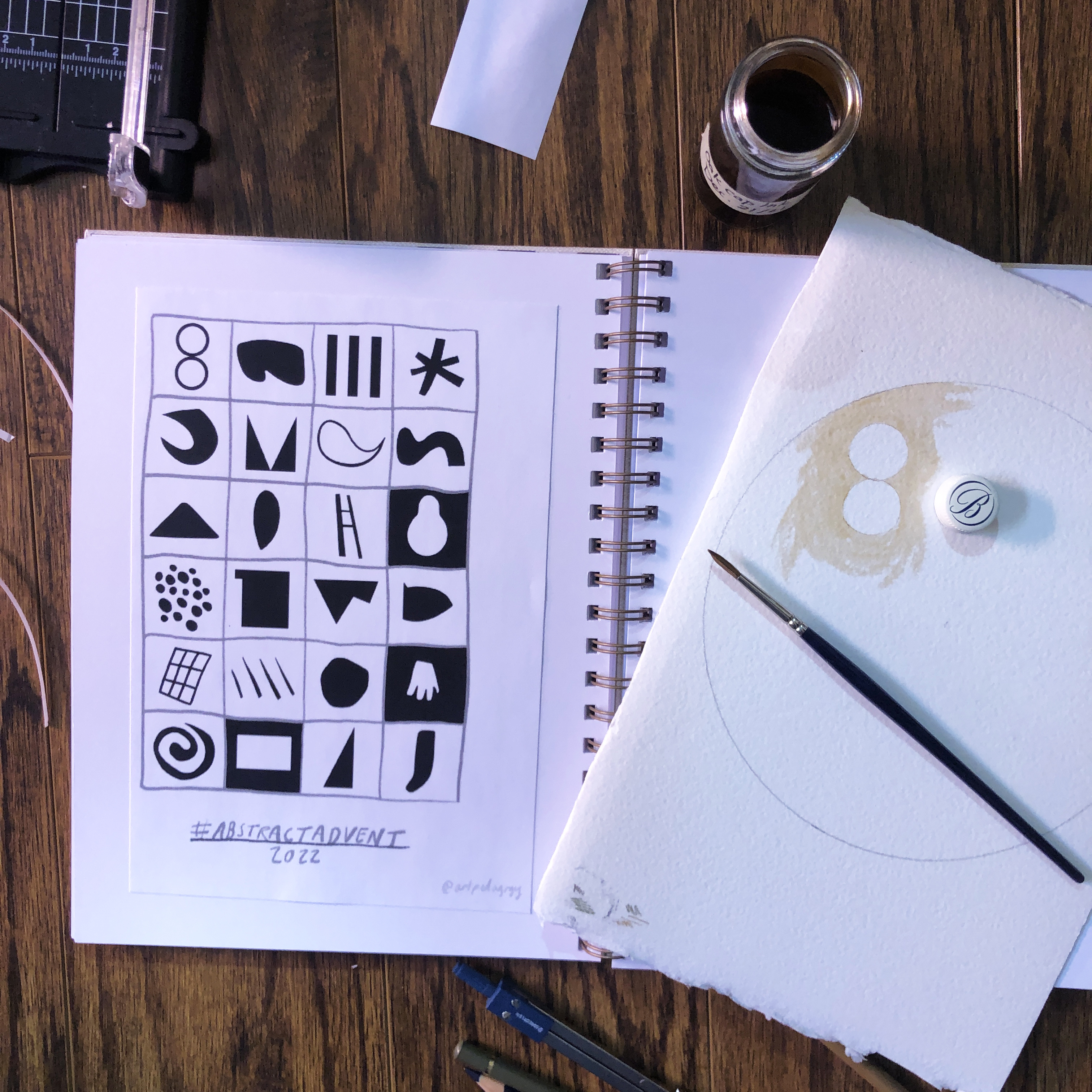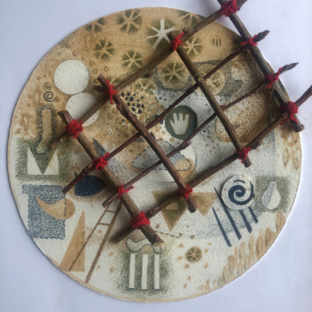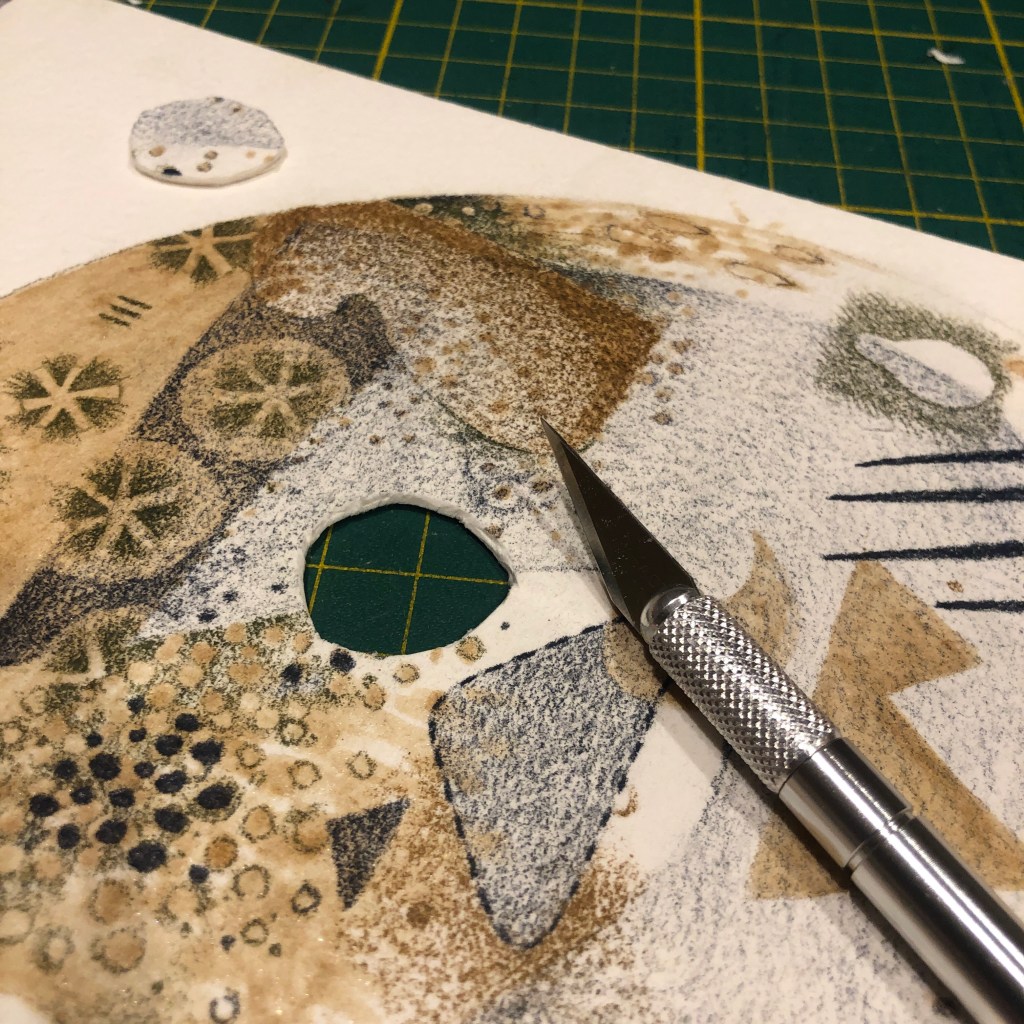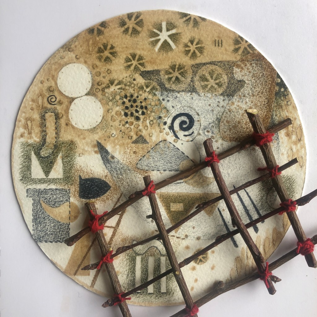 I again thoroughly enjoyed the 2022 instalment of #abstractadvent and completed another winter print for card giving. In both works I used an “ink” inspired by a recipe in Jason Logan’s book Make Ink. The acorn cap ink (minus the metal) from December 2021 held up well in the fridge and was useful in adding a sepia tone to parts of each image.