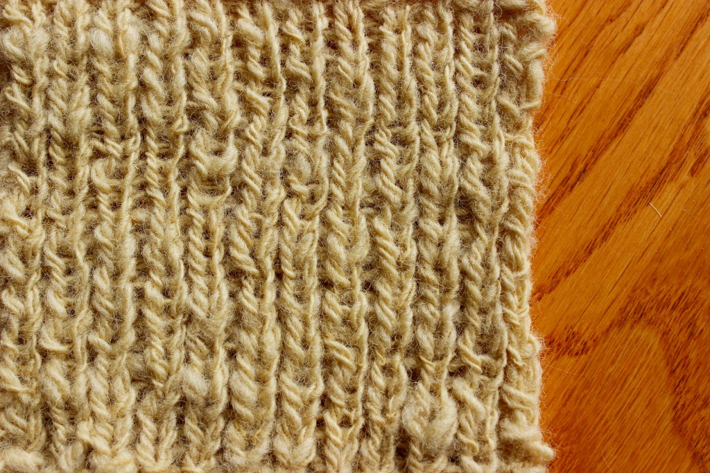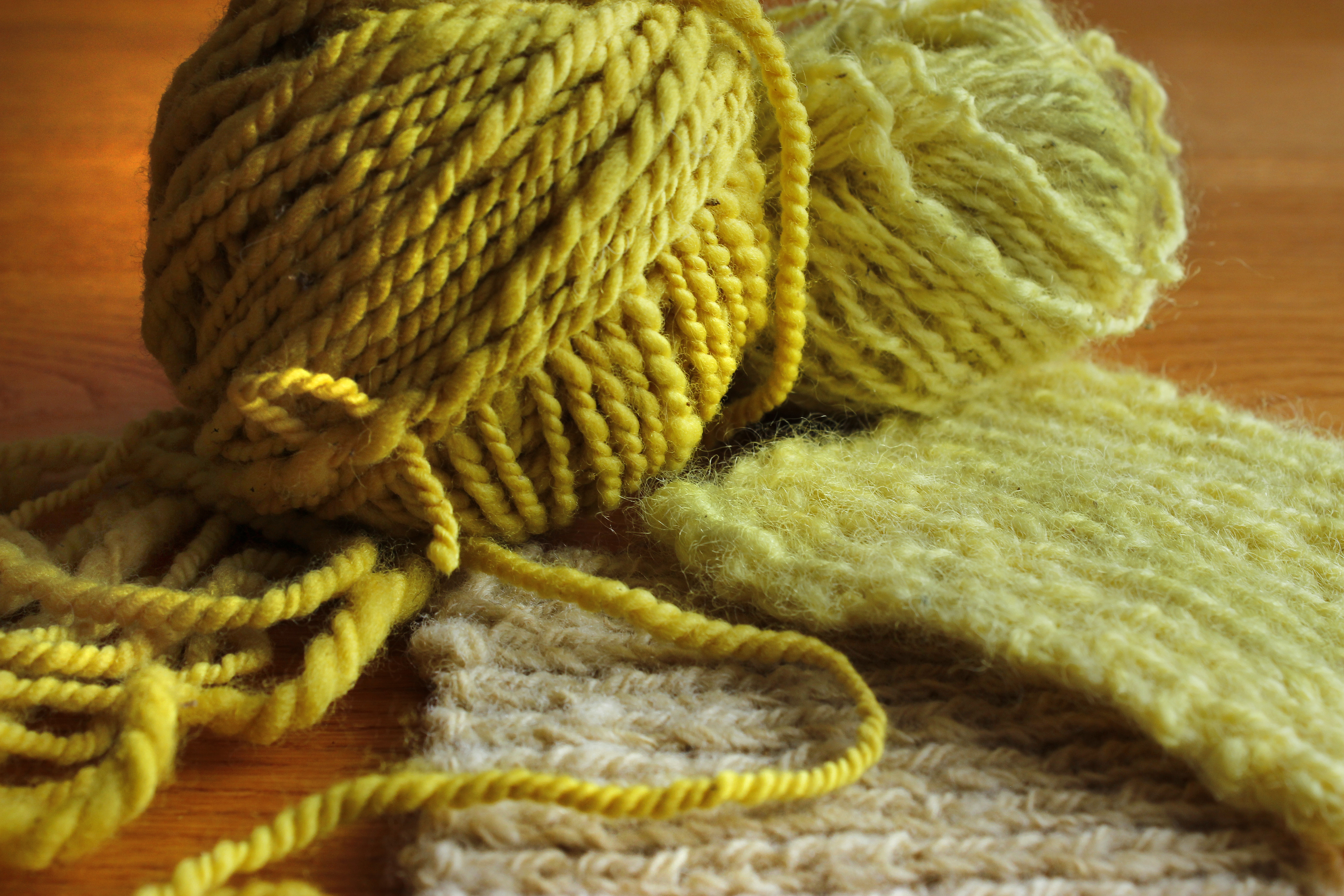 Two variations of Wolf lichen dye with the lighter one knit up and compared to last month’s Lilac twig dye. (Canon T3i, Feb. ’23)